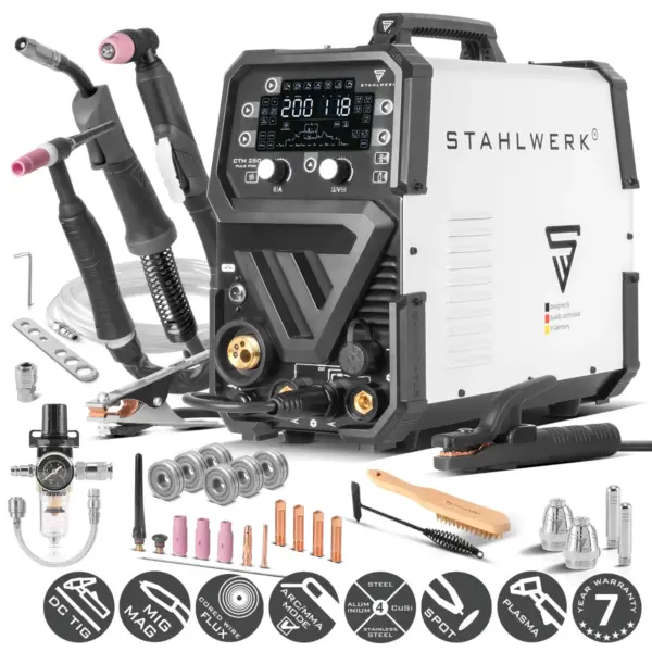 The STAHLWERK CTM-250 Puls Pro 6-in-1 combination welding machine is a powerful 6-in-1 inverter with 200A that combines the TIG, MIG/MAG, MMA and FLUX welding processes. Equipped with a pulse function, the welding machine is also suitable for processing cored wire and for welding thin sheet metal and aluminum (in MIG/MAG mode). The versatile STAHLWERK CTM-250 Puls Pro also has an integrated 45A plasma cutter with precise contact ignition for optimum ignition properties. Depending on the material, the cutting capacity is up to 10 mm (mild steel ST37 up to 10 mm, V2A or V4A up to 7 mm, aluminum up to 4 mm). The STAHLWERK CTM-250 Puls Pro is equipped with the latest generation of IGBT technology and impresses with its synergic wire feed and numerous individually adjustable welding parameters. Thanks to the pulse function in MIG/MAG mode, the device is even suitable for aluminum welding. A powerful 4-roller drive ensures reliable and continuous wire feed. In TIG mode (DC), the combi welder has a high-frequency ignition (HF) with 2-stroke/4-stroke mode. The infinitely adjustable gas follow-up protects the tungsten electrode and effectively protects against wear and oxidation. Integrated overheating protection on the STAHLWERK CTM-250 Puls Pro and high-performance cooling enable maximum power to be called up. In MMA mode, the STAHLWERK CTM-250 Puls Pro offers improved ignition results thanks to a hot start function, while the practical anti-stick function prevents the welding electrode from sticking. The versatile STAHLWERK CTM-250 Puls Pro is ideal for professional use in industry, trade and for DIY enthusiasts.