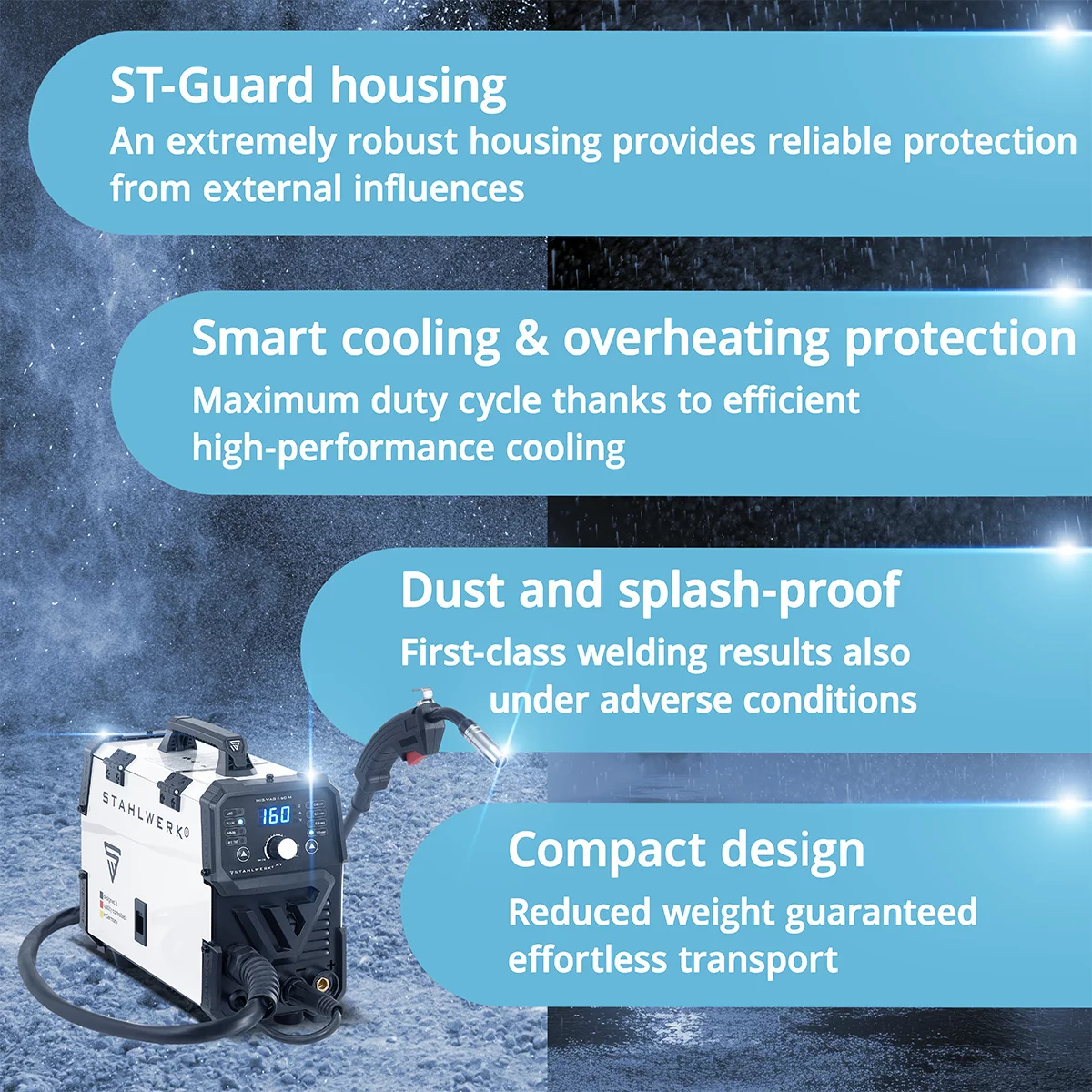 Stahlwerk Mig 160 M full synergic 5 in 1 mig welder is a combination unit with real 160 amps and 2-roll drive / flux cored wire Gasless mig welder, MIG MAG, ARC MMA, Lift TIG with a 7 Year Warranty on the power source. The very compact and lightweight STAHLWERK MIG/MAG-160 M gas-shielded welder operates at up to 160 amps and is suitable for MIG/MAG, Lift-TIG and E-Hand/MMA welding.