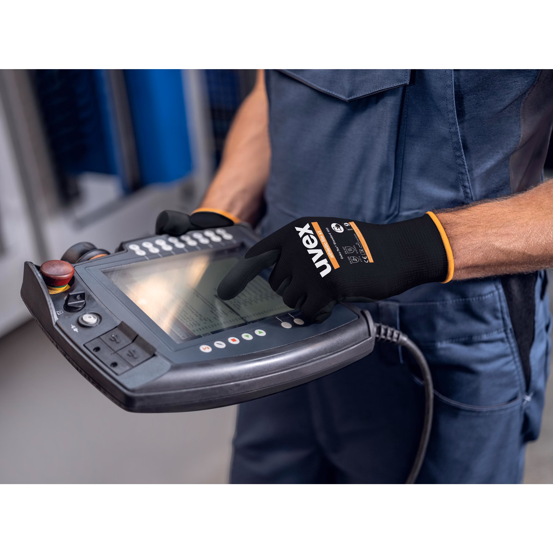 The UVEX athletic lite xt assembly gloves in a comfortable slim-fit design allow precision work with high levels of wearer comfort. The slim ergonomic fit allows the wearer to feel and grip workpieces very effectively. The fine-structured, open-pored microfoam coating makes the gloves very breathable, which reduces excessive perspiration. In addition, the product is suitable for industrial washing, is suitable for use with foodstuffs and is equipped with protection against contact heat up to 100°C. Thanks to touchscreen compatibility with all common screens, tablets and mobile phones, there is no need to take off the uvex athletic lite xt.