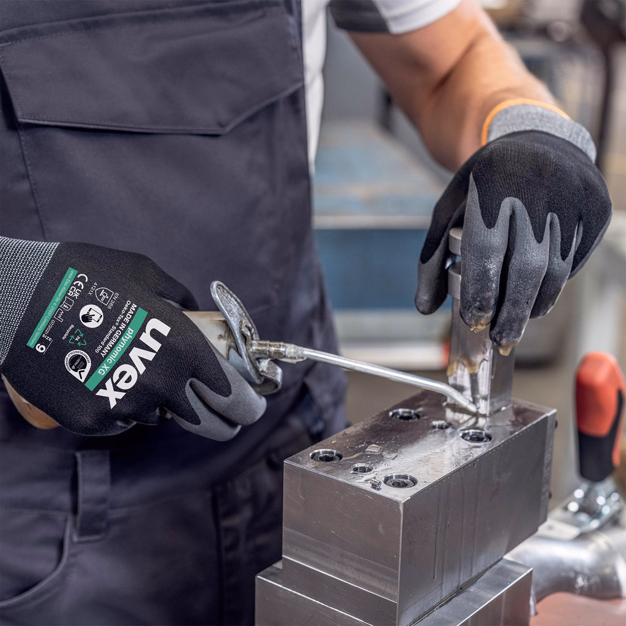Uvex Phynomic XG work gloves: the best oil grip in its class and sustainable too – made with >50% polyamide recyclate. The Xtra-Grip coating ensures excellent grip in oily environments and makes the glove extremely durable, for greater sustainability and increased safety.