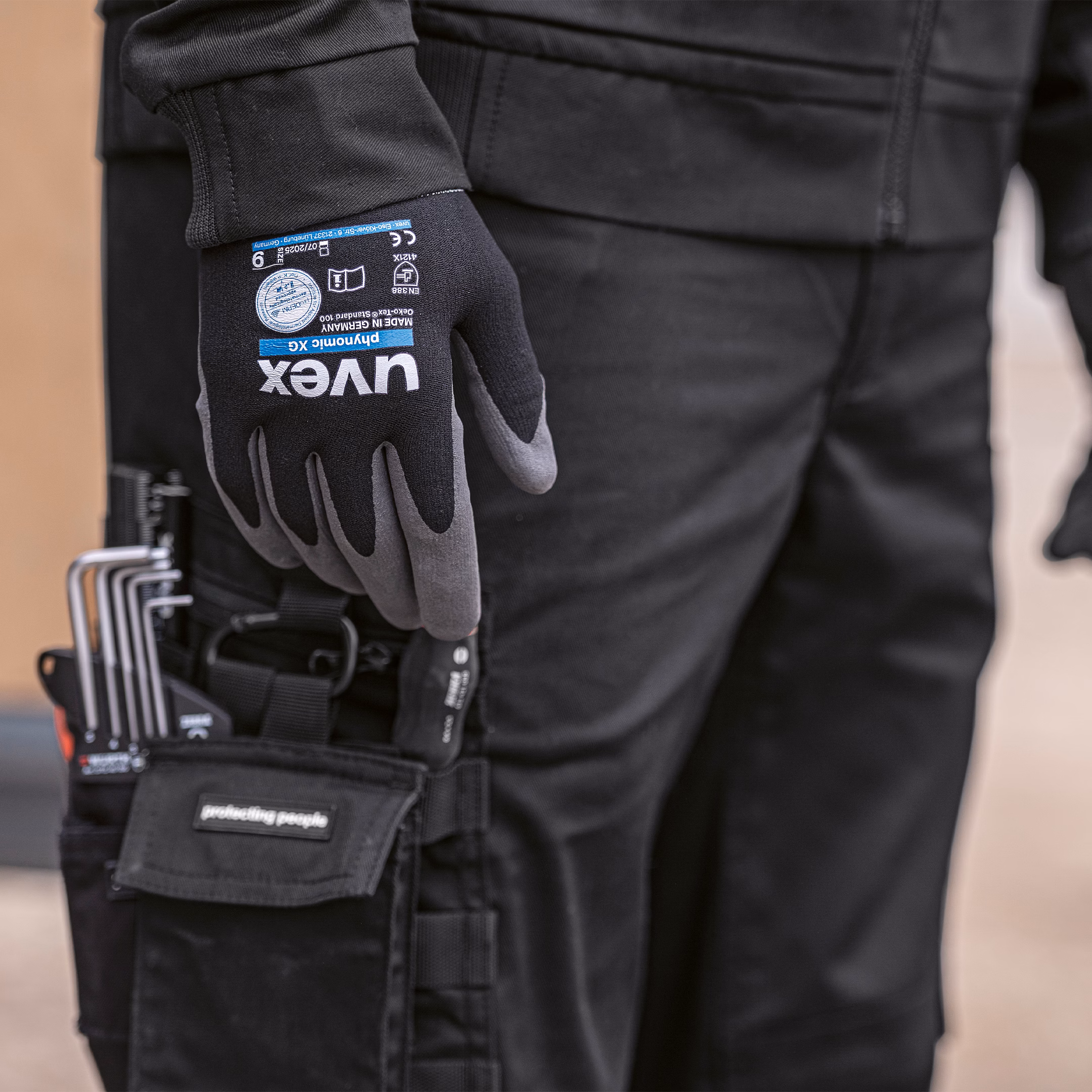 The Uvex Phynomic series of work gloves is ideal for all types of work where a high level of feeling is required. These touch-sensitive safety gloves fit like a second skin and are especially light and flexible – without making your hands sweaty. With its innovative Xtra Grip aqua-polymer foam coating, the Uvex Phynomic XG sets new standards in grip when working with oily items. Manufactured at our carbon-neutral production facility in Germany, the Uvex Phynomic XG is now made of over 50% sustainable material (polyamide recyclate). Thanks to touchscreen compatibility on all standard screens, tablets and mobile phones, you’ll never need to remove the Uvex Phynomic XG while working.